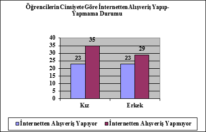 Öğrencilerin cinsiyete göre internetten alışveriş yapıp yapmama durumuna bakıldığında , kız öğrencilerden 35’nin %60.34’nün internetten alışveriş yapmadığı, 23 kız öğrencinin % 39.66 payla internetten alışveriş yaptığı görülmektedir. Erkek öğrencilerin durumu incelendiğinde ise 23 öğrencinin % 44.23’lük payla internetten alışveriş yaptığı, 29 öğrencinin %55.69 payla internetten alışveriş yapmadığı görülmektedir. Bu durumda kızların erkeklere oranla, internetten alışveriş yapmama oranı daha fazla olmaktadır(Şekil 1).
